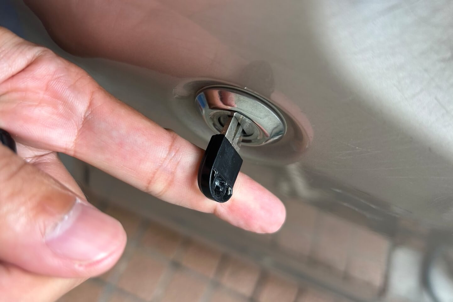 現場到着後、まずは運転席側のドアの鍵穴「シリンダー」をピッキングで無傷解錠し、非常解錠用のメカニカルキー/エマージェンシーキーをその場で削って作製します。